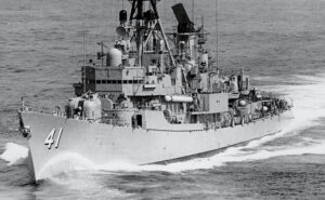 The painting of HMAS Warramunga reflects a major article in this edition which provides a potted history of the RAN in the Korean War. The images  of HMAS Adelaide reference the article about Adelaide’s Boarding party. It was only resourceful action by the ship’s helicopter, directed by the Flight Commander, that enabled the Boarding Party to be safely recovered, thereby averting an international incident.