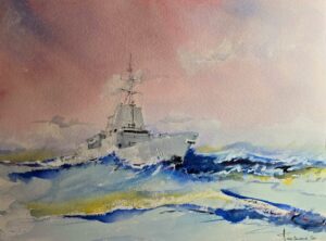 The painting of HMAS Warramunga reflects a major article in this edition which provides a potted history of the RAN in the Korean War. The images  of HMAS Adelaide reference the article about Adelaide’s Boarding party. It was only resourceful action by the ship’s helicopter, directed by the Flight Commander, that enabled the Boarding Party to be safely recovered, thereby averting an international incident.
