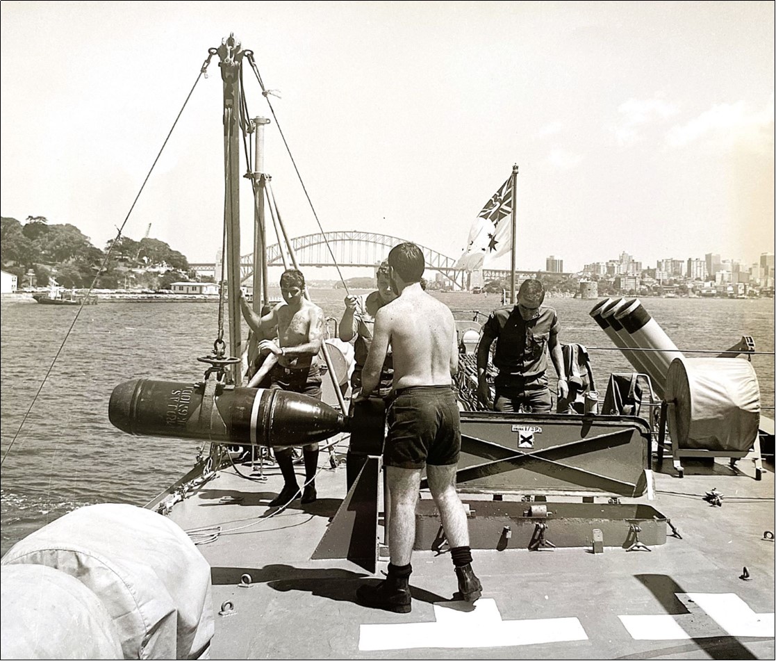 Right Crew aboard HMAS Vendetta load Limbo mortar bombs in preparation for Exercise AUCKEX 77 RAN. Kingsley Perry · Sep 3, 2025 ·