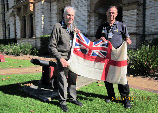 Norm Rivett hands Ensign to Commander Peter Cole 25 May 2017