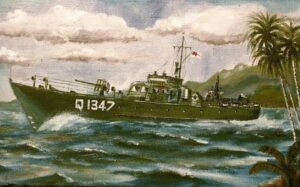 The painting of HMAS Warramunga reflects a major article in this edition which provides a potted history of the RAN in the Korean War. The images  of HMAS Adelaide reference the article about Adelaide’s Boarding party. It was only resourceful action by the ship’s helicopter, directed by the Flight Commander, that enabled the Boarding Party to be safely recovered, thereby averting an international incident.