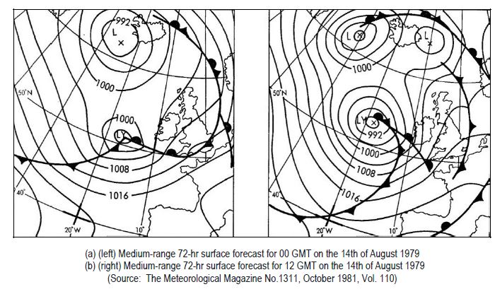 This allowed the RORC to pass the information to the yachts prior to the start of the race (1350). The RORC made no arrangements to receive updated forecasts during the race because they had no means of transmitting the information to the competitors, who mainly relied on the BBC shipping forecast, compiled by UKMO, once they had sailed. At the final briefing, which took place shortly before the start of the race, again after consultation with the CFO at Bracknell, the possibility was indicated of winds reaching gale force (Beaufort force 8) at times from Tuesday the 14th of August onwards. The charts (a) and (b) at right were not available until after that briefing. The models were still underestimating the deepening of the low, a known deficiency, and so the forecasters preparing charts (a) and (b) had subjectively deepened the low by 12 mb more than the model was predicting. This also proved to be a considerable underestimation. It is worth mentioning that on the 12th of August, a forecast prepared by Southampton Weather Centre for Offshore Instruments Ltd in connection with the Fastnet Race included the possibility of severe gales (Force 9) on the 14th, in line with the medium-range guidance and outlooks issued from the CFO. However, the shipping forecasts, which were the main source of weather information for the yachtsmen, contained no such information since the major intensification of LY was expected to take place after the 24-hour period covered by the forecast.