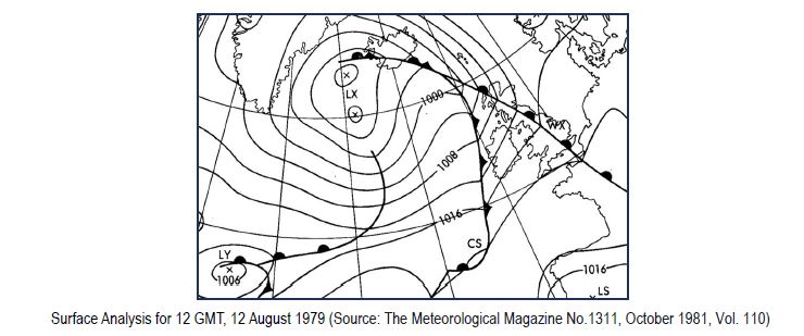 In August this year, I watched a Channel 5 TV documentary on the disastrous Fastnet Yacht Race of 1979. Thatdocumentary was of particular interest to me as I had been the RN duty weather forecaster at Northwood from 0700 to1900 on the 13th of August, which was just before the worst of the storm hit the racing yachts overnight on the 13th and14th of August. Fastnet races are biennial events that happen in August every other year and organised by the RoyalOcean Racing Club (RORC) in conjunction with the Royal Yachting Association (RYA) based at Cowes on the Isle of Wight.