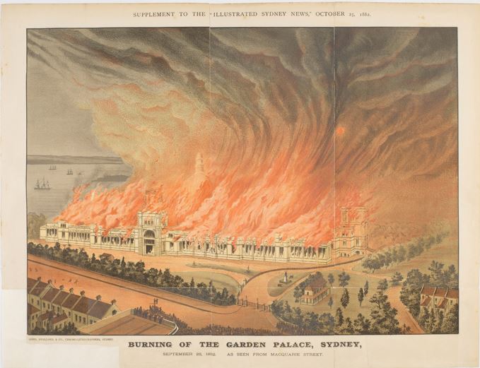 The Melbourne Royal Exhibition Building remains to this day but not so Sydney’s Garden Palace which was burnt to the ground in the early hours of 22 September1882, only three years after opening. The fire was devastating, and although the local fire brigades were assisted by seamen from ships in the harbour, it was beyond containment. Not only was the building lost but all of its contents were destroyed, containing public records relating to the 1881 census and including significant specimens and artefacts gathered as the foundation collection to a national museum. So ferocious was the fire that the windows in the terraces along Macquarie Street cracked with the heat and debris was blown away as far afield as Elizabeth Bay. And the centrepiece under the dome, a bronze statue of the Queen/Empress, melted. The building does not appear to have been insured which was quite common in those times.